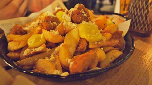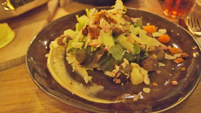 The menu is surprisingly small compared to the amount of choice available for drinks, but that only makes choosing a meal easier. Everything available on the menu does sound very nice. I decided to for the ‘walk in the woods’-salad, with mushrooms, bacon, chestnuts and cepesmayonnaise. My partner went for the chicken and chips; crispy chicken thighs with potato wedges and spicy curry mayonnaise.
