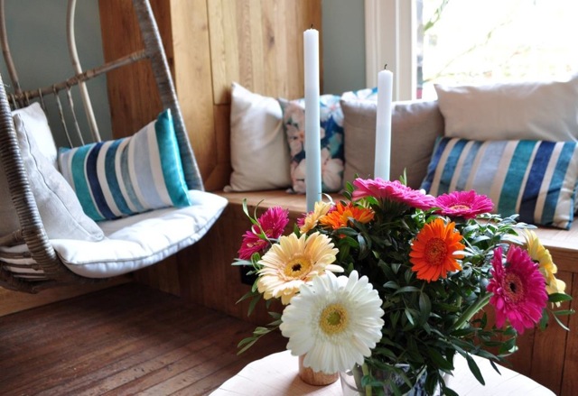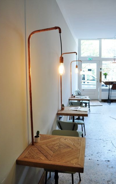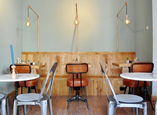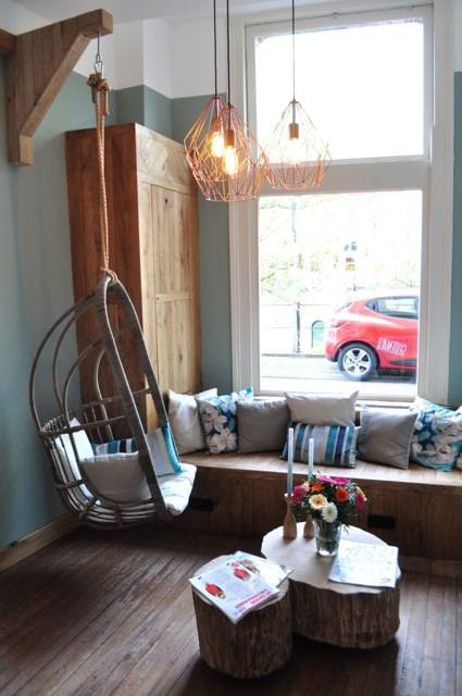 Upon entering, you don’t know where to look. In the back is a large counter, a reading table with beautiful chairs and to the right cozy tables for two. Left a large wooden bench and beautiful chairs made of leather. And a wooden window bench with colorful pillows, where you can plop down with a fine magazine or for a chat with a friend. And if you dare you can take a seat in the hanging egg and cradling the whole afternoon whilst drinking a cup of coffee.