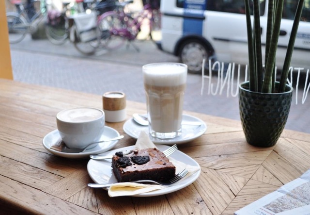 At ‘ t koffieboontje you can order more than just coffee. Just think of different flavors chai tea lattes, tasty fruit juices, smoothies, yoghurt with Granola and of course delicious freshly baked goodies. The counter is stacked with oreo brownies, carrot cake, cheesecake and even gluten-free almond honey cake and raw food snacks. All just waiting for you. The oreo brownie is definitely recommended. The plate was empty in a blink of an eye. Guess I’m not sharing next time.