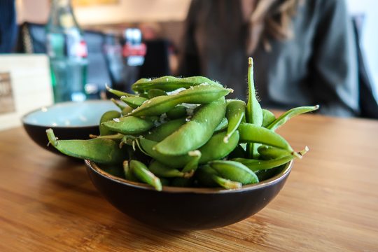 We chose a few appetisers to whet our appetites: fresh and salty edamame, delicious vegetable dumplings, and a surprisingly tasty and savoury combination of nashi pear and red cabbage.