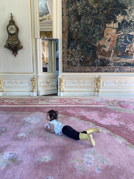 Vooraf aan de voorstellingen kunnen kinderen ook een kijkje nemen in Slot Zeist. De gidsen van Gilde Zeist geven namelijk heuse kinderrondleidingen. Ze vertellen allerlei spannende verhalen over het kasteel en laten de kleintjes spelenderwijs kennis maken met de geschiedenis van deze mooie plek. Zo mocht Leela voelen aan de muurschilderingen, mocht ze op het tapijt gaan liggen om te kijken naar de plafondschilderingen en leerde ze welke dieren herkennen in bepaalde beelden.