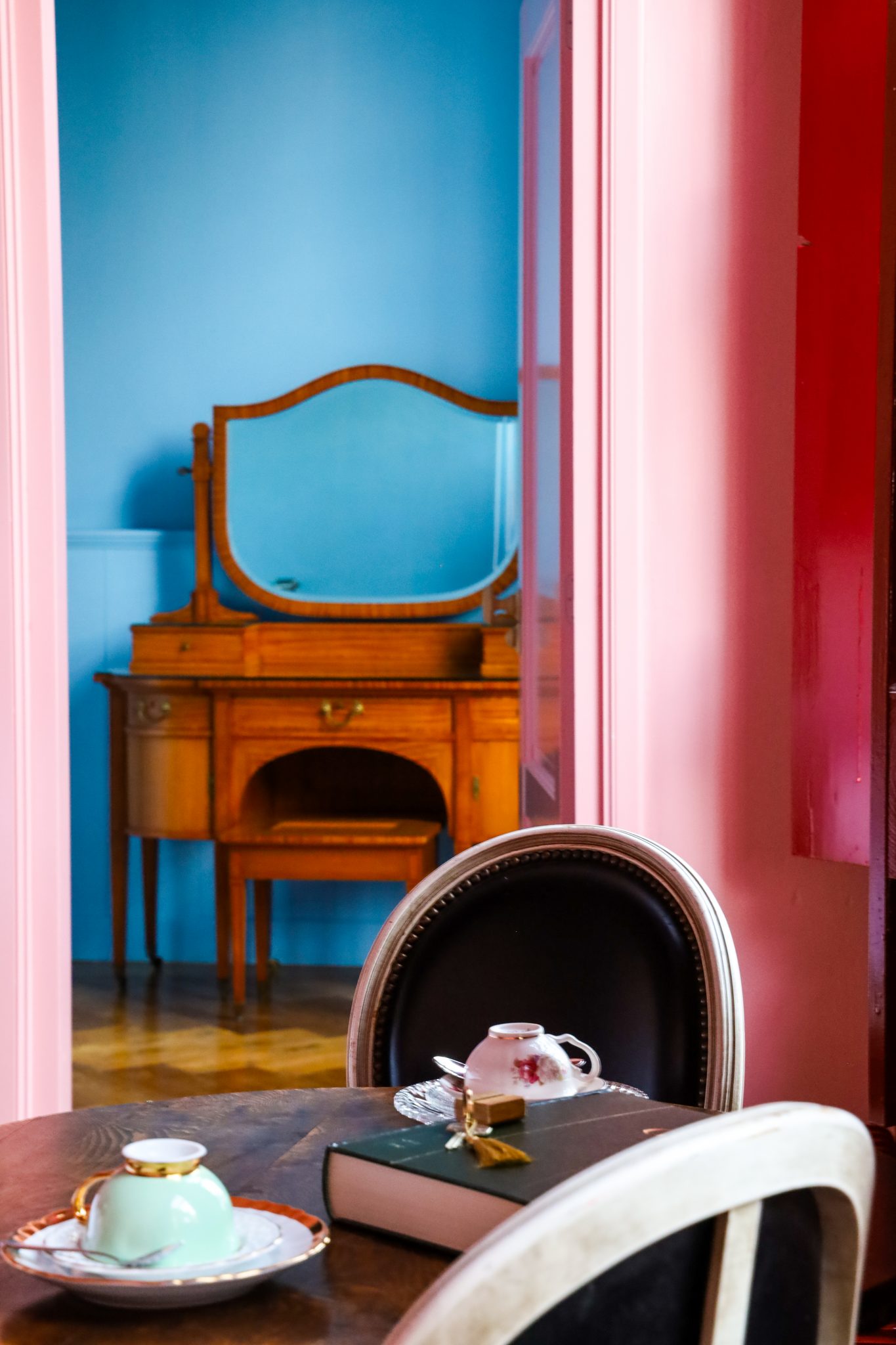 Ik mocht overnachten in de ruime prachtige roze en blauwe kamer. Bij het openen van de deur was ik opslag verliefd. De kamer was ruim met een apart toilet en badkamer. De kleuren spetterde van de muren. Het toilet was zachtroze. De badkamer met een ruime douche en kaptafel zachtblauw. De kamer zelf is geschilderd in een prachtige diep roze kleur. Deze mooie kleuren in combinatie met enkele antieke stukken, zoals nachtkastjes, tafel, stoelen en een fauteuil gaf de kamer een luxe uitstraling.