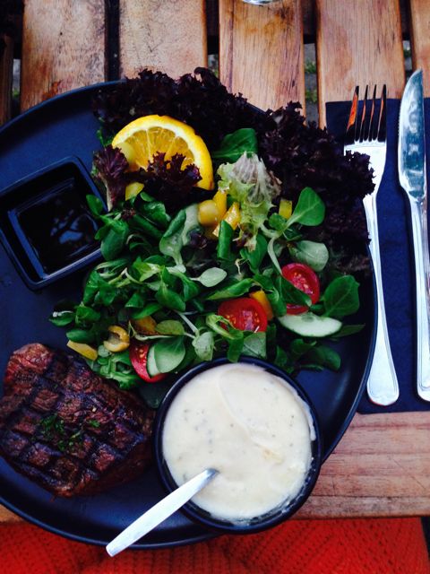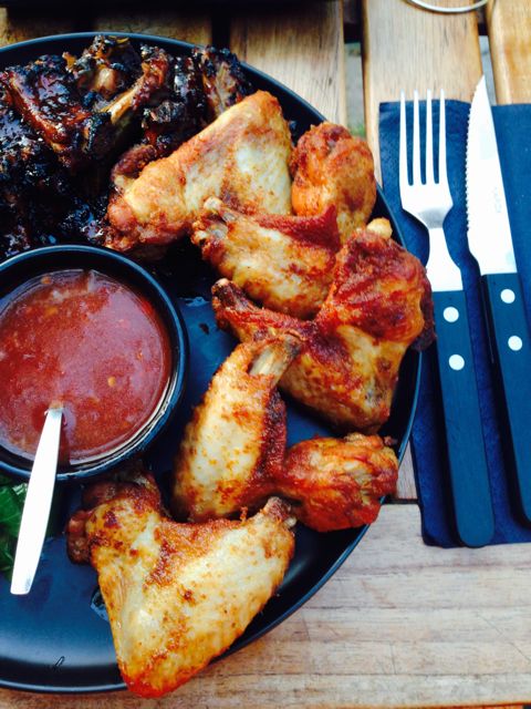 Het menu? Ladingen vlees, zoals steaks en spareribs, maar ook vis, salades, bijgerechten en desserts. Om te beginnen nam ik het borrelplateau van kleine babyribs, kip en dip. Heerlijk! De babyribs waren zeer mals en lekker op smaak. En de kip was mals met een knapperig korstje. Precies zoals ik mijn kippetjes graag eet.
