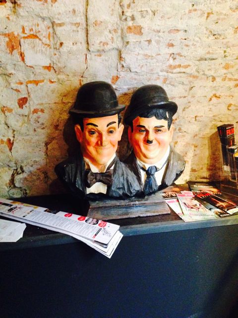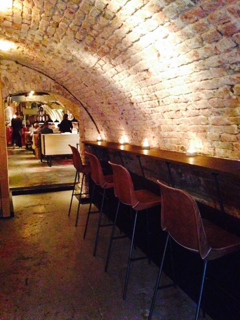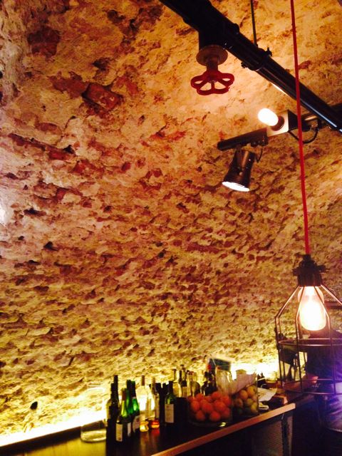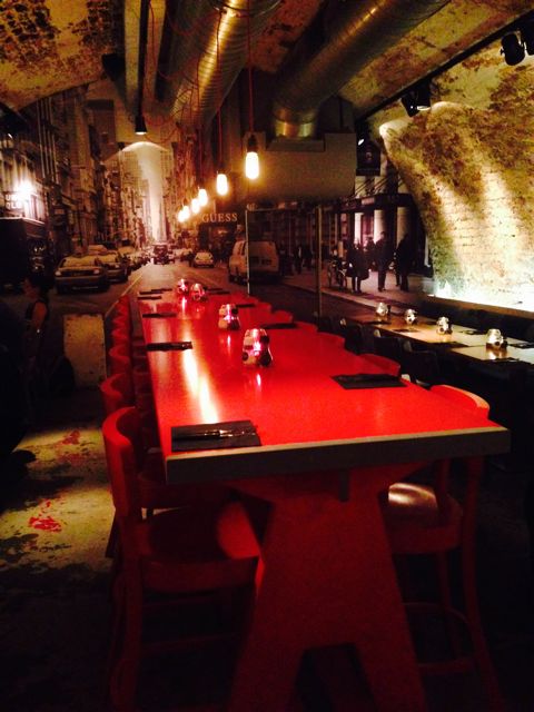 Na het zien van de oude foto’s van het restaurant kan ik zeggen dat het een aardige klus is geweest om het restaurant te verbouwen tot de huidige stylish spot aan de gracht die het nu is. Schilderijen van Amerikaanse filmsterren en skylines op de kale bakstenen muren, industriële lampen die extra licht geven aan de nogal schemerige verlichting van het restaurant aan het plafond. De rode sprinklers geven een subtiel Amerikaans tintje aan de inrichting. En de bank gemaakt van oude jeans van personeel en gasten is een leuke toevoeging. De nieuwe bar is het middelpunt van het restaurant, waar je ook een drankje kunt drinken en alvast een starter kunt nuttigen. Als aandenken aan de oude inrichting is een deel van een oude muurschildering op de voorste muur bewaard gebleven. Houten tafels en stoere leren stoelen vullen de ruimte. Het glamoureuze gevoel wordt benadrukt door de rode stoelen aan de grote tafel achterin het restaurant. Het geheel klopt volledig!