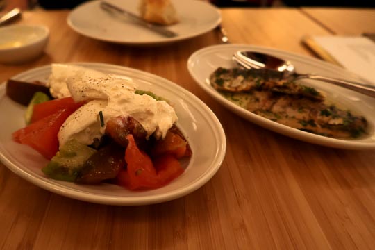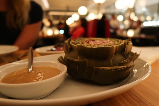 Nadat we veel te lang getwijfeld hebben wat we willen bestellen, besluiten we iets te kiezen van elke categorie. Vis, vlees en vega; water, platteland en bergen. De tomatensalade die we als eerste op tafel krijgen ziet er knapperig uit, het bolletje burrata is heerlijk romig. Dan krijgen we de sardientjes, super mals en zwemmend in een pure marinade. Wat olie, wat kruiden, top! We krijgen nog entrecote, geen opsmuk, maar dat heeft het ook niet nodig. Wanneer een stuk vlees goed is, dan behoeft het geen tierelantijnen. Hetzelfde geldt voor de witvis. Deze bistro gerechtjes zijn keurig. En lekker. De grootste uitdaging was de artisjok! De hele bloem komt op tafel, gelukkig weten wij wat je daar mee moet doen. Maar mocht je dat niet weten, dan legt de bediening je dat graag uit. Alle blaadjes opeten, totdat je bij het zachte hart komt. Trouwens, de wijnen op de kaart zijn goed, Frans en passend bij de gerechten.