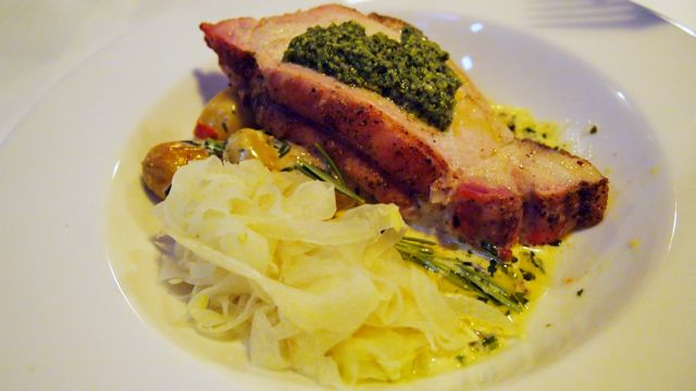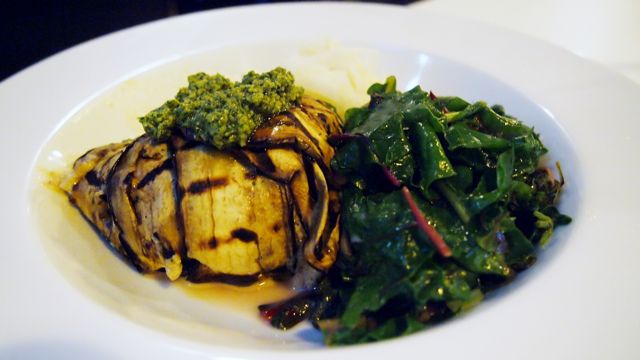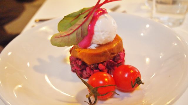 Om ons een zo compleet mogelijk beeld te geven nam ik de vegetarische opties en mijn vriend de vis en vlees versie van het menu. Als voorgerecht mocht ik als gelegenheidsvegetariër genieten van een salade van biet, snijbiet en een gepocheerd ei. Mijn vriend kreeg een heerlijke vissoep voorgeschoteld, zo goed gevuld dat je door de verse mosselen, gamba’s en krab de soep amper kon zien! Beide gerechten smaakten heerlijk en wij waren erg benieuwd naar het hoofdgerecht. Voor hem een mals stuk Braambrugs big, voor mij gegrilde aubergine gevuld met ricotta en gegrilde paprika, beide vergezeld met een dot zelfgemaakte pesto. Mijn smaakpapillen dansten van geluk!