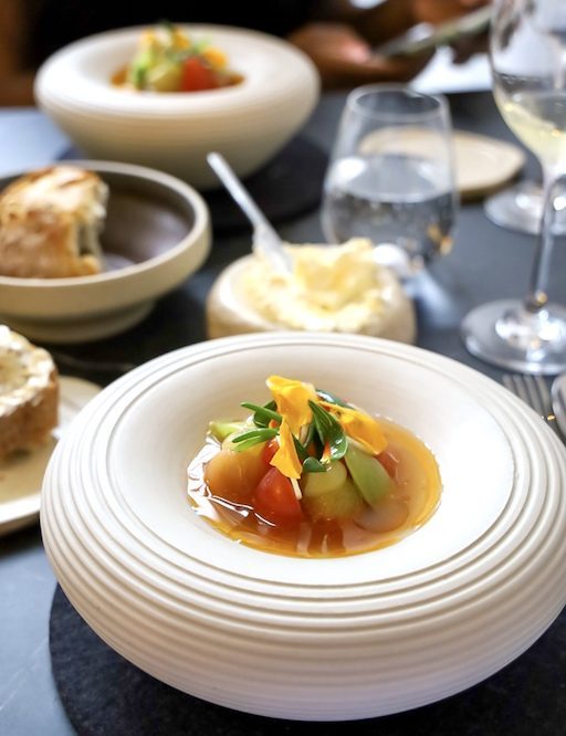 Daarna volgde een gerecht van tomaat. Dat klinkt niet heel spannend, en zelfs de sommelier gaf aan dat hij in het begin dacht ‘tomaat?!’. Het bleek ook niet makkelijk om er een goede wijn bij te kiezen. Maar na 10 flessen te hebben geprobeerd kwam hij wederom in ons eigen land uit, bij een Sauvi uit de Betuwe. Een slimme manier om onze verwachtingen te temperen want we waren ontzettend verrast door de smaakexplosie van deze tweede tomaten-gang. Misschien wel ons favoriete gerecht van de avond! Terwijl ik niet eens van tomaat houd normaal, maar dit mag Tommy wel elke dag voor me maken.