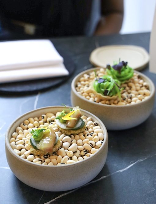 Chef Tommy kookt graag verfijnd en staat bekend om zijn frisse, lichte gerechten. Hiervoor gebruikt hij veel producten van Hollandse bodem en sterker nog vaak komen ze uit een eigen moestuin bij de Galgenwaard. We begonnen de avond met een zeebaars, gecombineerd met pandan, komkommer en kalamansi, een Aziatische citrusvrucht. Het gerecht was fris maar toch smaakvol.