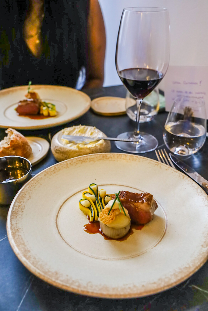 De derde gang was heilbot met bloemkool, beurre blanc en zilte groenten. De beurre blanc mocht op tafel blijven want een top-up van deze saus is geen straf. En over beurre gesproken, meteen even een speciale vermelding voor het brood – of beter gezegd de boter die ze erbij serveerden. Zo boterzacht zie je ze niet vaak. Het hoofdgerecht was een lamsgerecht. Hollands lam met lamsfilet, lamsnek, courgette en een jus met daslook. Wederom bleef het kannetje op tafel staan, we like. We kregen er een Bulgaarse rode wijn bij die Bordeaux-achtig was maar net even anders dan de standaard Bordeaux.