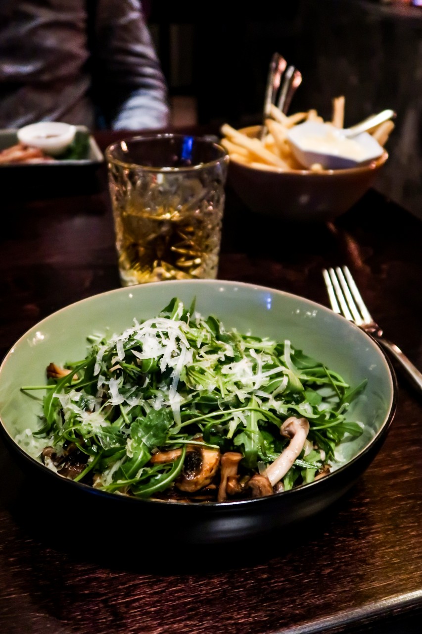 Omdat ik meedoe aan de actie ‘Week zonder Vlees’, kies is twee vegetarische gerechten van de kaart: bietensalade als voorgerecht en als hoofdgerecht de risotto. Uiteraard bekijk ik ook even de rest van de kaart en zie al snel dat er ook genoeg lekkers op staat voor vlees- en visliefhebbers. De zeebaars met polenta, zeekraal, kreeftenjus en gegrilde groenten klinkt als muziek in de oren. Evenals de kalfswang gestoofd in wijnjus.
