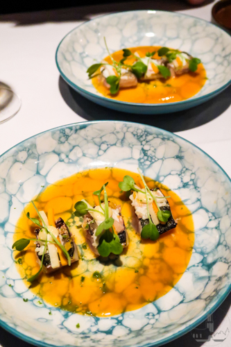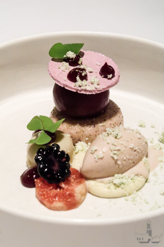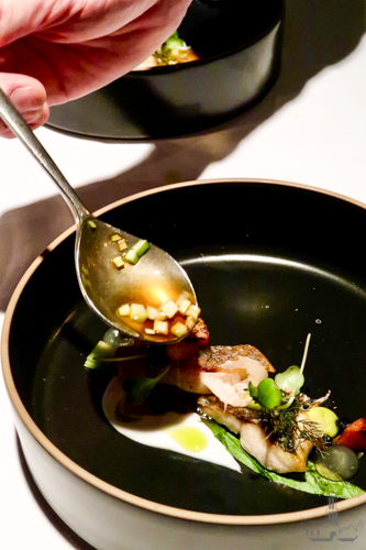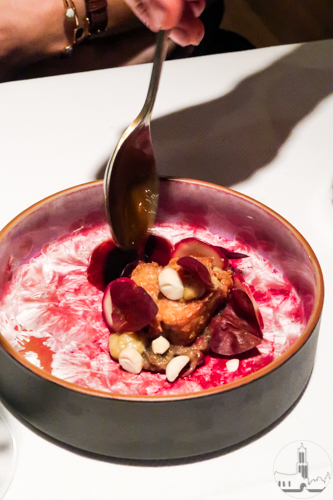 Na de drie heerlijke amuses volgde een parade aan mooie en smaakvolle gerechten. Alle gerechten zijn simpel en zacht van smaak. Een van de gerechten wordt door de chef gepresenteerd en aan tafel afgemaakt met een sausje uit een koperen pannetje. Van alle gerechten was de kalfszwezerik met rode ui in Cabernet Sauvignon, rode biet, walnoten en jus de veau, mijn favoriet. Het vlees was licht van smaak en boterzacht met krokante rode ui en het aardse van rode biet.
