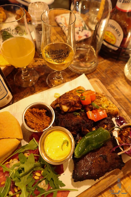 In combinatie met de zes bieren wordt er een plank met heerlijke bites geserveerd. Pittige kippenvleugels, zoete spareribs, stevige worstjes, brood met dip, gegrilde paprika, nacho’s en pulled pork sieren de hapjes plank. Alles wordt klaar gemaakt in de green egg. Het vlees is heerlijk mals en wordt goed op smaak gebracht met kruiden. De fall-of-the-bone ribs zijn zoet en mals, wat goed past bij een donker biertje zoals de Estrella Damm Daura. En de pittigheid van de kippenvleugels kun je prima wegspoelen met de frisse Mongozo.