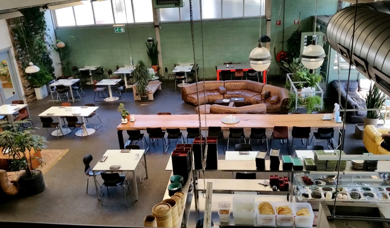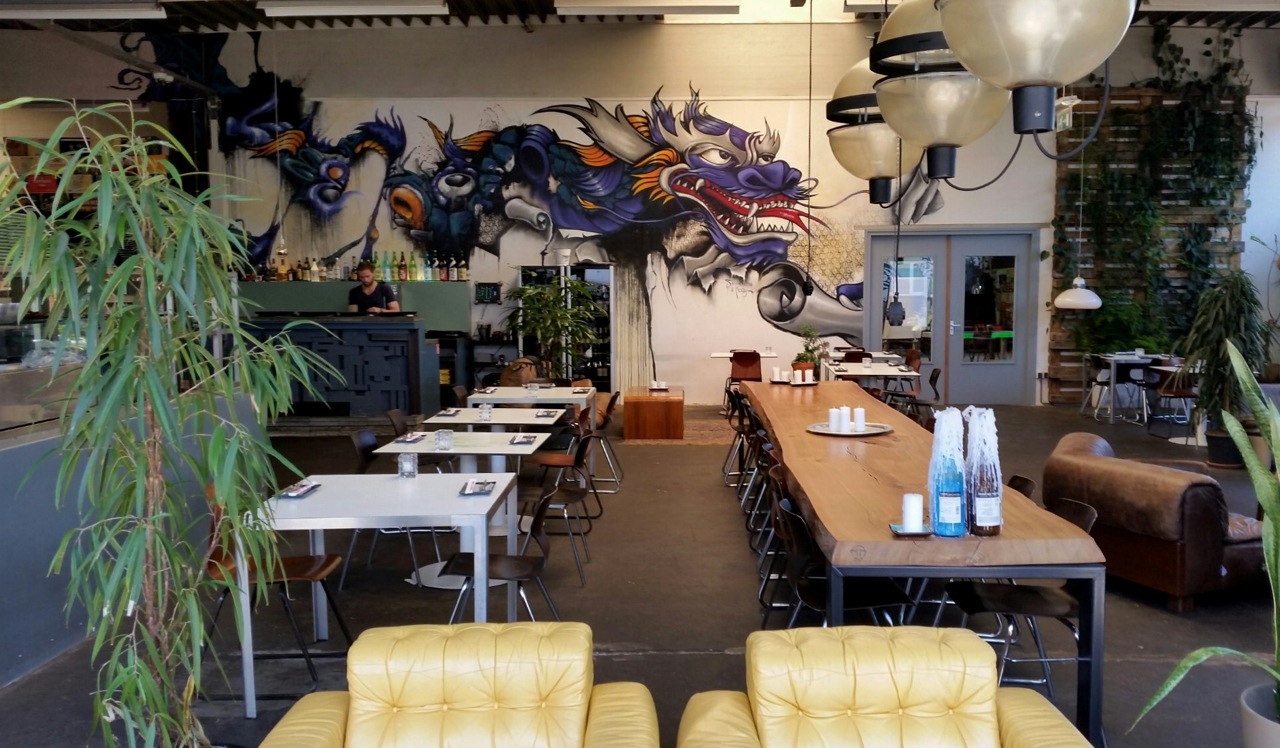 LE:EN is gevestigd in een industrieel pand op een kleinschalig bedrijventerrein in Hoograven. Ik was er midden in de winter, maar ze hebben een mooi terras met relaxte stoelen, gedeeltelijk aan het water, dus ook in de zomer is het bij LE:EN goed toeven. Binnen is het groot, heel groot met een hoog plafond verschillende restaurant gedeeltes en ook zitgedeeltes met comfortabele banken. Aan de inrichting is duidelijk tijd besteed, met gigantische muurschilderingen en gave lampen. De open keuken staat centraal in de ruimte.