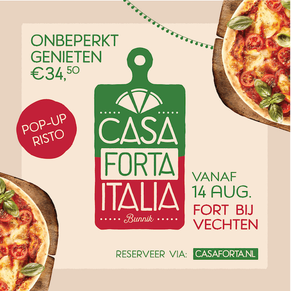 Het succesvolle concept van Kasteel Casa Cammingha strijkt dit keer neer bij Fort Vechten. Een totaal andere omgeving dan het kasteel, maar Fort Vechten is een unieke plek met veel historische waarde. Fort Vechten ligt op het snijpunt van de Romeinse Limes en de Nieuwe Hollandse Waterlinie. Dat het Waterliniemuseum hier gevestigd is, is dus geen verrassing. Tijdens Ristorante italiano geniet je van pizza’s rechtstreek uit de houtgestookte steenovens. De avond begint met antipasti en een goed glas wijn. Struin over het fort en geniet van de natuur tussen de gangen door.