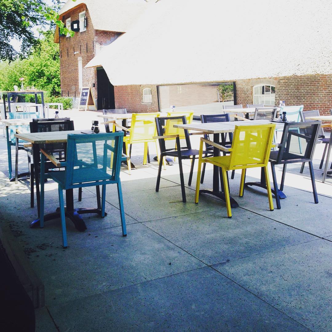 Op het terrein, waar eeuwen geleden een kasteel stond, staat nu een prachtig landelijk restaurant met een gigantisch terras. Tafels met gekleurde stoelen, zwarte loungebanken en zelfs een klein fonteintje. Je kunt op het terras zitten, loungen of hangen. En dat de hele dag door als je wilt! Je kunt natuurlijk ook plaatsnemen in het mooie, strak ingerichte restaurant.
