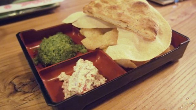 De avond begon met een plateau met bread & dips. Dit staat al een tijd op het menu en is hopelijk ook een blijvertje. De manager heb ik dan ook gevraagd om de bread & dips niet van het menu te halen. Het is gewoon simpel en lekker. Ik ben vooral fan van de kokos-korianderchutney. Lekker dippen! Om de smaakpapillen te zuiveren dronken wij een frisse Tsuru Ume Yuzu sake gemaakt van de Wakayama yuzu vrucht, een Japanse citrusvrucht.