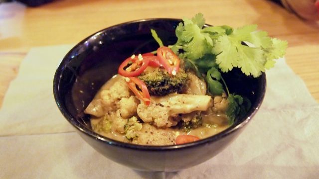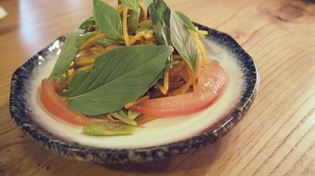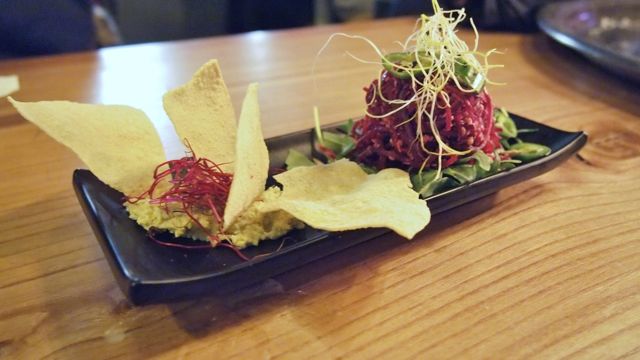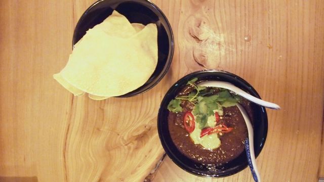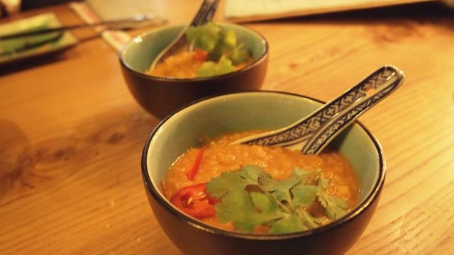 Daarna volgden twee salades en een soep: rauwe pompoensalade, rauwe bietensalade en een rode linzensoep. De linzensoep was rijk van smaak en ontzettend vullend, dus hier hebben wij maar weinig van gegeten. (Ja, want we waren pas begonnen.) Ik vind garnalen niet lekker, en omdat die op de pompoensalade zaten viel deze bij mij niet in de smaak. Lisa daarentegen vond de salade wel lekker. Maar de favoriet van deze eerste gang was toch wel de rauwe bietensalade met rucola, zonnebloempitten, groene chili, komijn en papadumchips. Side note: je moet wel van komijn houden, want de smaak is heel aanwezig (maar niet overheersend) in de bietensalade. Ook bij deze gerechten werd een bijpassende sake geschonken. De Kizan, een fruitige sake met tonen van appel en anijs, afkomstig van het eiland Honshu.
