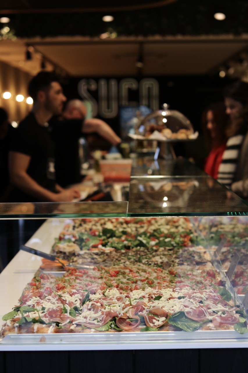 De pizza bij Sugo is anders dan bij de gemiddelde (afhaal)pizzeria of pizzaketenje haalt er namelijk pizza al taglio(vertaald ‘gesneden pizza’, oftewel stukken vierhoekige plaatpizza). Dit is oorspronkelijk afkomstig uit Rome. Het geheim van een goede pizza al tagliozit ‘m niet alleen in de toppings, die simpel, maar wel van hoge kwaliteit zijn, maar vooral in de bodem. Het deeg wordt heel puur bereid: meel, water en gist, that´s it. Het krijgt lang de tijd om te rijzen wat resulteert in een luchtige bodem die niet zwaar op de maag ligt.