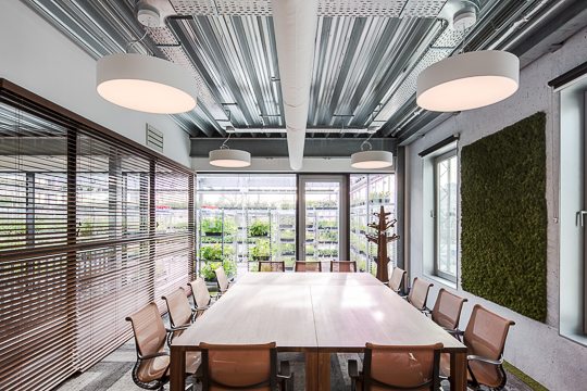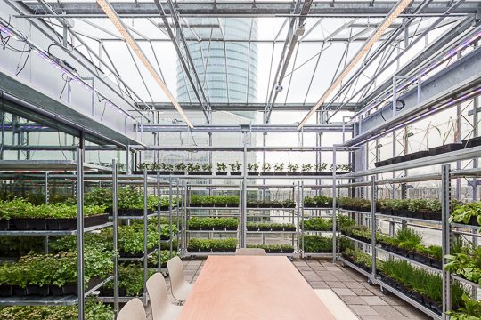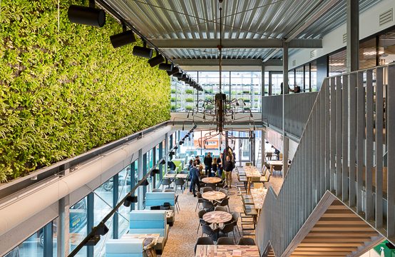 Naast gezellig eten en drinken, kun je bij The Green House ook prima werken. Je kan niet alleen met een laptopje neerstrijken in het restaurant, maar er zijn ook even circulaire vergaderruimtes te huur! Elke vergaderzaal heeft een thema. Zo kun je vergaderen in de ‘Urban Mining’ zaal waarvan de inrichting bestaat uit een verzameling van vondsten van het grofvuil en verschillende tweedehands winkels. Of de ‘reclaimed’ vergaderzaal die een vloer heeft gemaakt van visnetten en stoelen van plastic uit de oceaan. De toiletten zijn oude zeecontainers. Op de muren van deze vergaderruimtes prijkt meer informatie over de circulariteit van het gebouw. Vanuit de vergaderruimtes kijk je uit op de schitterende groene muur die boven het restaurant prijkt of de even groene kas!