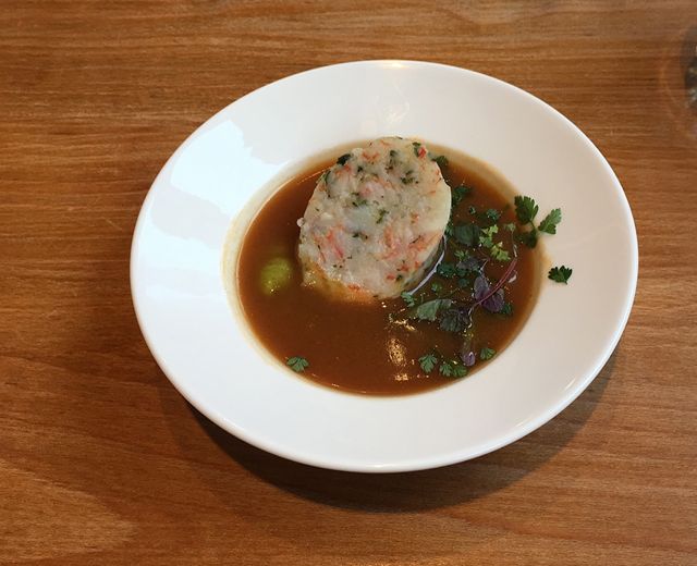 Door de prachtige historische Lange Nieuwstraat lopen we naar de Twijnstraat en via het trapje naar de gracht voor onze vierde stop: De Heeren van Leeuw. Ik heb nooit geweten dat hier een restaurantje ligt, dus dat is een leuke verrassing. We worden vriendelijk ontvangen en krijgen een tafeltje aangewezen. De witte wijn die we hier geserveerd krijgen is gemaakt van blauwe druiven. Ze verwijderen dan het schilletje voor het persen, zo laat ik me vertellen. Een heel aparte wijn dus, maar wel erg ‘mineralig’ en naar onze smaak iets te ‘zuur’. Het gerechtje is een coquille in tomatensaus met een rolletje van courgette met parelgort. Het is lekker, maar in vergelijking met de andere gerechten die we al proefden, is deze wel wat minder bijzonder.