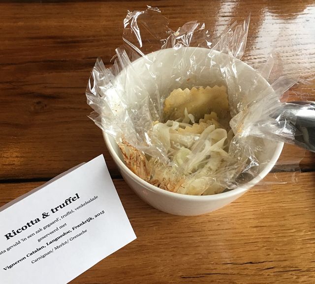 Ons startpunt is het recent geopende Gare du Sud aan de Oosterkade. Als we binnen stappen in deze Franse bistro mogen we een tafeltje uitzoeken en we nemen plek bij het raam. We krijgen uitleg over de wijn die wordt geschonken en over de combinatie van de wijn met het gerecht. Als het gerecht geserveerd wordt, krijgen we ook daar uitgebreide uitleg over. We proeven een ravioli met ricotta in truffelsaus, gegaard in een zakje in de oven, met een frisse venkelsalade. Gecombineerd met een zachte jonge rode wijn uit Frankrijk. Erg lekker! Ik vraag onze gastheer naar de bereidingswijze van het gerechtje. Ook daar krijg ik uitgebreide informatie over. Kijk, dat is leuk! Een mooie plek om nog een keer een avondje te gaan dineren.