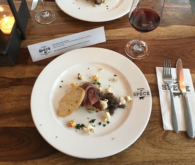 We steken het Ledig Erf over naar onze laatste bestemming: Speck Bar & Grill. Van dezelfde eigenaren als Gare du Sud en Firma Pickles in de Drieharingenstraat. Dit restaurant heeft één van de gaafste interieurs van Utrecht (vind ik dan ;-)) Je loopt als het ware een enorme slagerij binnen. Hier krijgen we – uiteraard – een rode wijn; een Zuid-Afrikaanse combinatie van Cabernet Sauvignon en Merlot. Met een rokerig aroma en een licht kruidige, maar zachte afdronk. Prima passend bij de gegrilde flanksteak met uiencompote en groene-kruidenmayonaise die erbij geserveerd wordt. Leuk detail: op de grote koe op de rijpingskast in de zaak kunnen we precies zien waar ons stukje vlees vandaan komt. Een goede afsluiter van een erg geslaagde middag.