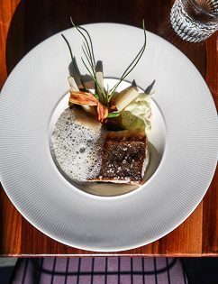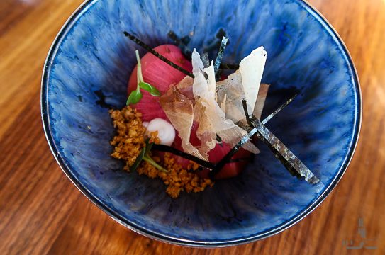 De auberginepuree met gedroogde tonijn flakes wordt als eerste op tafel gezet. Wat een amuse! De dames van de bediening vertellen bij elke gang met bravoure wat er op het mooie servies ligt. En uiteraard willen wij bij elke gang ook een bijpassende wijn proeven. Dat mag toch bij de lunch op zondag? De uitleg van de wijn-spijscombinaties is top, vraag er vooral naar.
