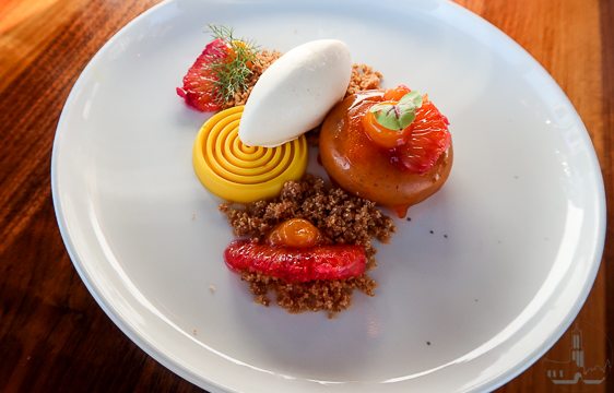 Skrei, zo wordt uitgelegd, is een soort kabeljauw, die we nu geserveerd krijgen met risotto, pulpo en bisque. Mijn glas wordt volgeschonken met een geurige wijn, eveneens perfect bij het gerecht. Ik kijk nog eens goed om me heen, naar de Dom, en prijs me weer gelukkig. We genieten van de beleving en van de stad. Dit geluk wordt bekroond met een dessert, dat we eerder in een museum terug dachten te vinden, dan op een bord. Wat een kunstwerk! Bloedsinaasappel, witte chocolade, saffraan, kaneel…