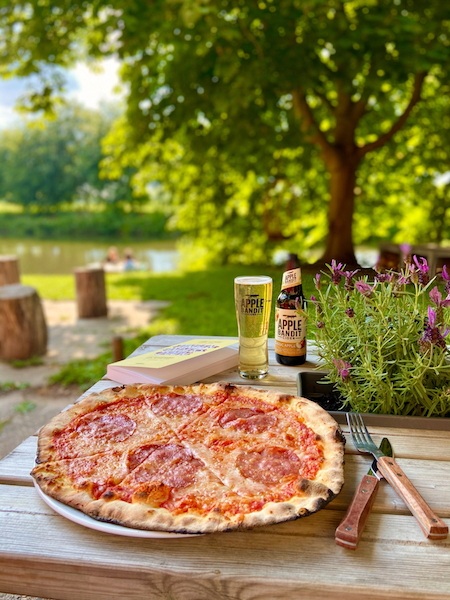 Mijn vakantiegevoel was meteen aan! Helaas was de tafel aan het water al gekaapt. Maar gelukkig kon ik plaatsnemen aan een tafel voor twee op het gras met uitzicht op het water. De menukaart is simpel, geen gedoe maar gerechten die iedereen wel kan waarderen. Ik besloot om een op hout gegaarde Italiaanse pizza te bestellen met een glas ijskoude cider. Pakte mijn boek uit mijn tas en besloot dat Fort de Batterijen voor deze zomer een van mijn vaste plekjes zou zijn. Terwijl een groep kinderen plezier hadden op de trampoline, genoot ik van mijn pizza met salami.