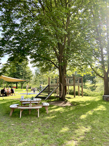 Mijn eerste bezoek aan Fort de Batterijen maakte grote indruk. Wat een enorm terras! Het fortterrein is gezellig ingericht met tafels en stoelen, banken, lounge stoelen en grote houten statafels. Je kunt zelfs zitten op het terras van de boomhut met uitzicht op het kanaal. Of op het terras aan het water met het gezelschap van de ganzenfamilie die af en toe voorbij zwemmen. Dit is de plek op het fort om te genieten van een speciaal biertje of glas wijn.