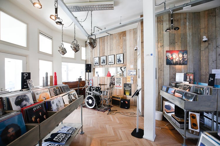 En als je dan eenmaal je favoriete plaat hebt gevonden, kun je er ook een mooie fles wijn bij uitzoeken. Want in het pand zitten ook nog eens een slijterij en een wijnhandel. In feite kun je in deze winkel dus een heel mooie avond bij elkaar winkelen.