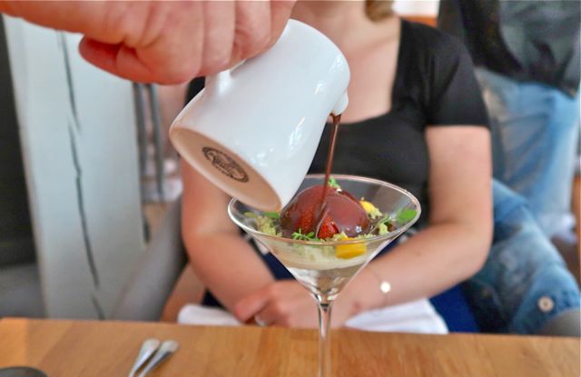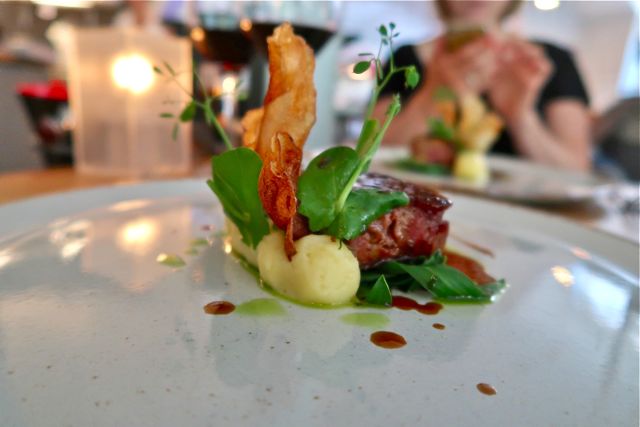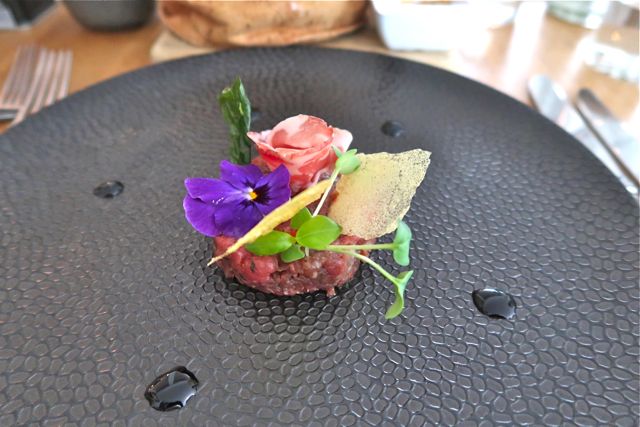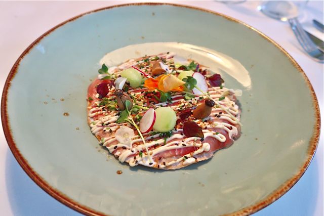 Dat is het thema van de vier-gangen lunch die de chef, tevens eigenaar Gregory, voor ons heeft bedacht. We beginnen met een mandje brood met heerlijk zachte boter en gefrituurde tuinbonen. Geduldig wachten we op de eerste gang. Dit is een pizza met tonijn; het romige van de ricottacrème en het pittige van de wasabi is in balans en de meloen balletjes zorgen voor een frisse bite. Erbij krijgen we een glas pinot grigio. Vervolgens worden wij verrast met een steak tartaar gemaakt op Italiaanse wijze. De gerechten zijn niet alleen heel lekker, maar zien er ook prachtig uit!