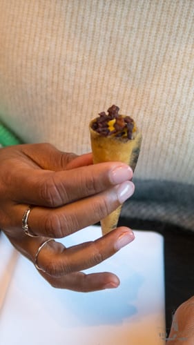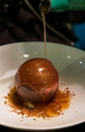 De avond hebben we afgesloten met een chocolade verrassing: een chocolade bol gevuld met matcha en caramel ijs en witte chocolade crumble. Over de chocolade bol werd warme rooibos thee geschonken. Een heerlijk einde van deze donkere herfstdag.