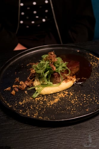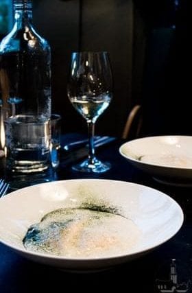 Vervolgens wordt een lichte pasta, van het deeg van dumpling, gevuld met zalm en Parmezaanse kaas aan tafel gepresenteerd. De pasta was luchtig, waardoor de smaken van de zalm en Parmezaanse goed tot hun recht kwamen. Hierna volgde een lang gegaard stuk kalfsnek met snijboontjes, aardappelpuree en dragon saus.